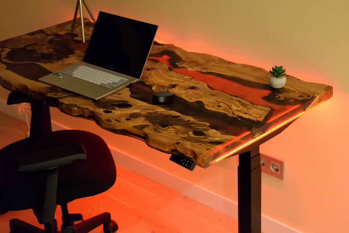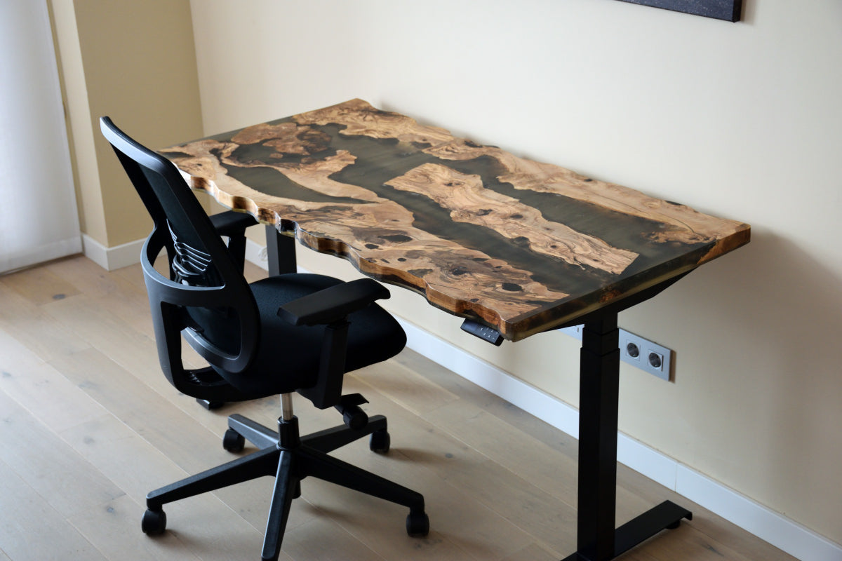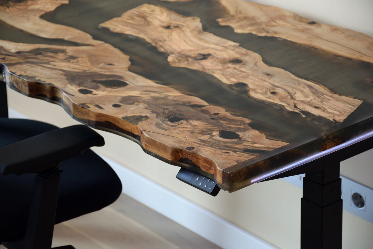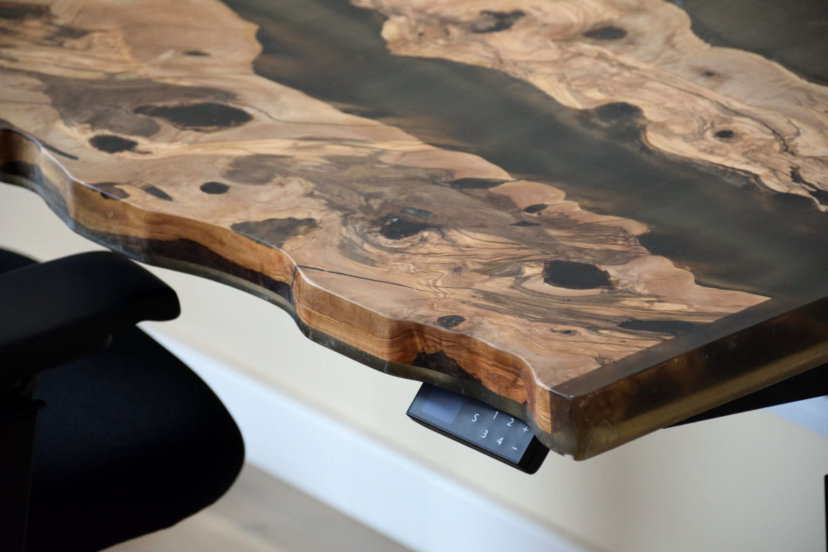 Price for a lifting table in olive or walnut and epoxy resin, in sizes 120x60, starting at €2,099