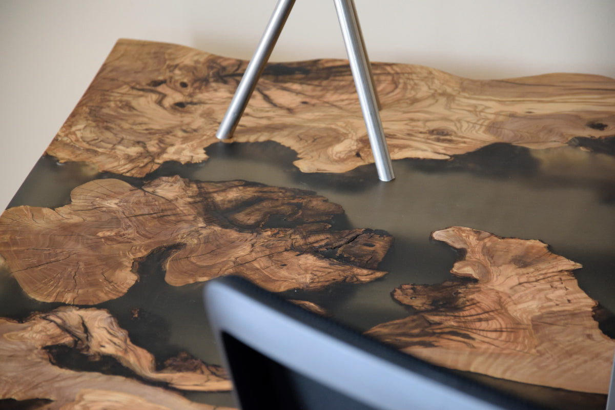 Solid olive wood, broken pieces whose cracks and rough edges are covered with epoxy resin, fully customizable to your desired shade. Translucent, transparent, completely solid, design your own, and we'll take care of the rest. Contact us to finalize all the details of your table design.