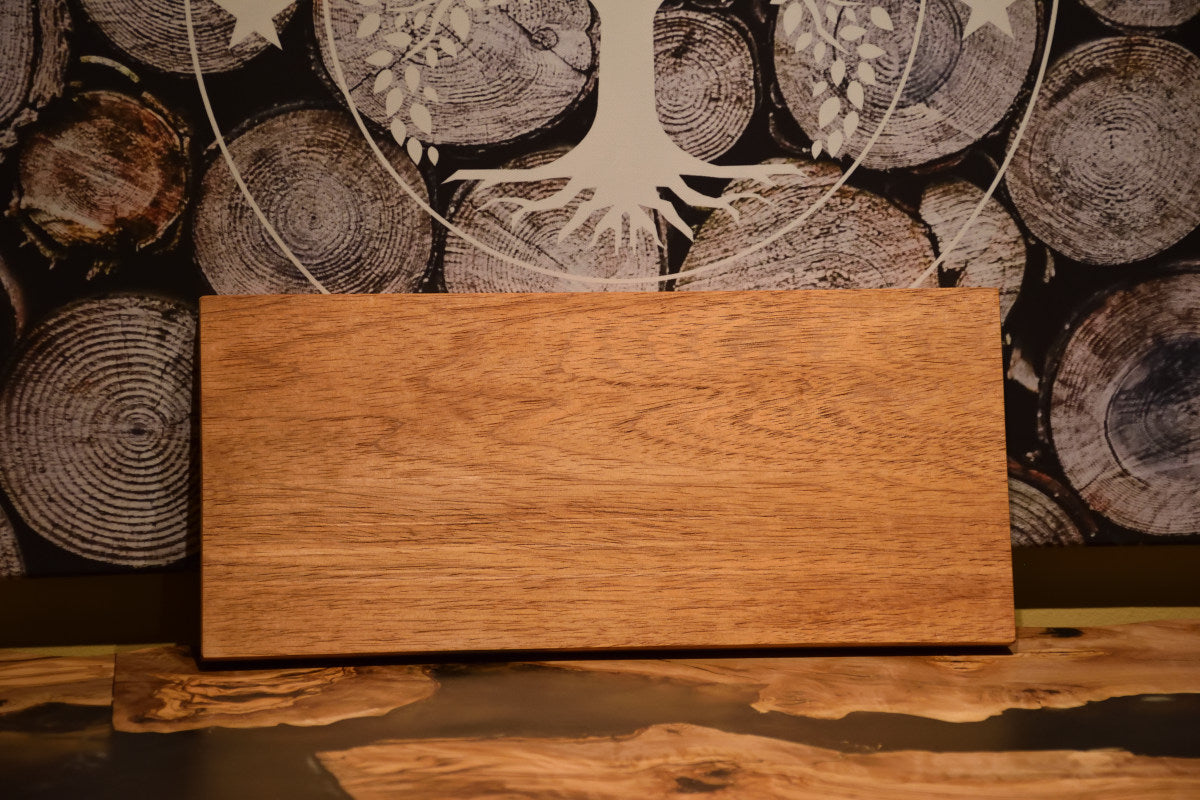 Llévate un trocito de madera natural de Bubinga macizo de 40cm de largo, por 18cm de ancho y 2cm de grosor, una madera veteada castaña única al natural aceitada, grabada con laser con el nombre o alguna palabra especial que nos indiques.