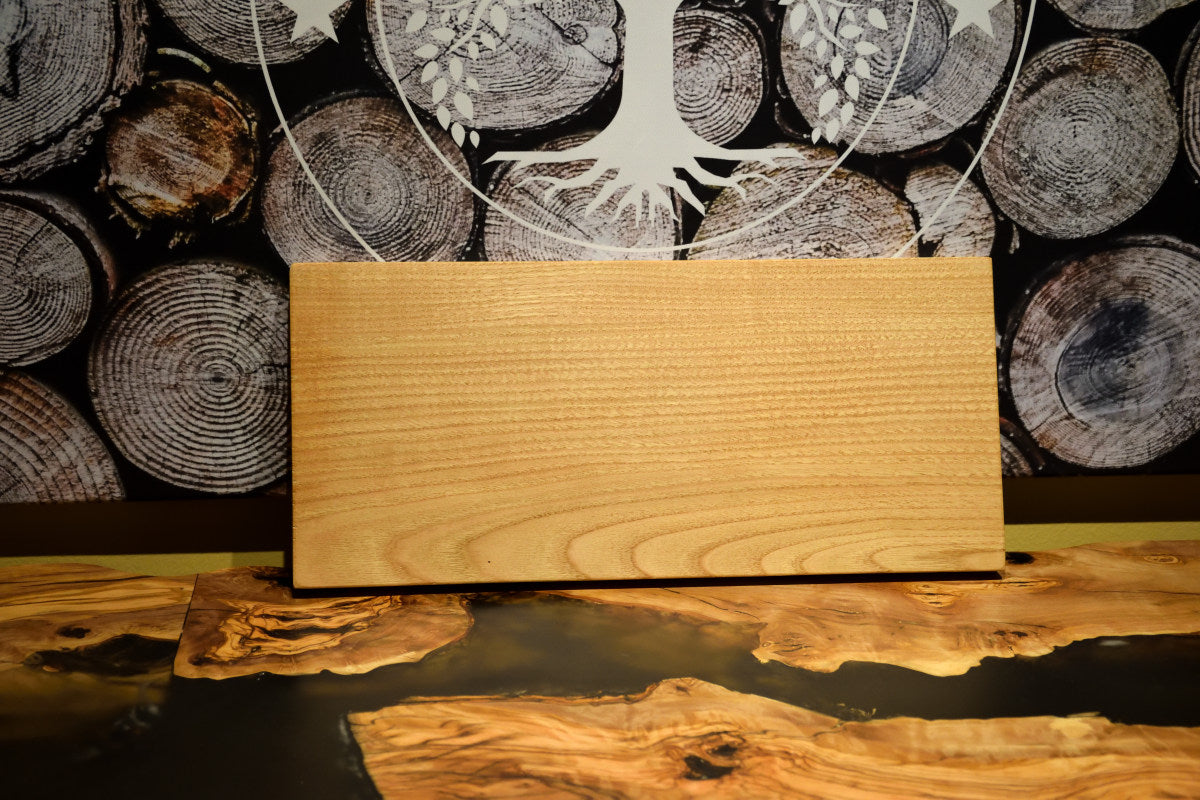 Llévate un trocito de madera natural de Castaño macizo de 40cm de largo, por 18cm de ancho y 2cm de grosor, una madera clara única al natural aceitada, grabada con laser con el nombre o alguna palabra especial que nos indiques.
